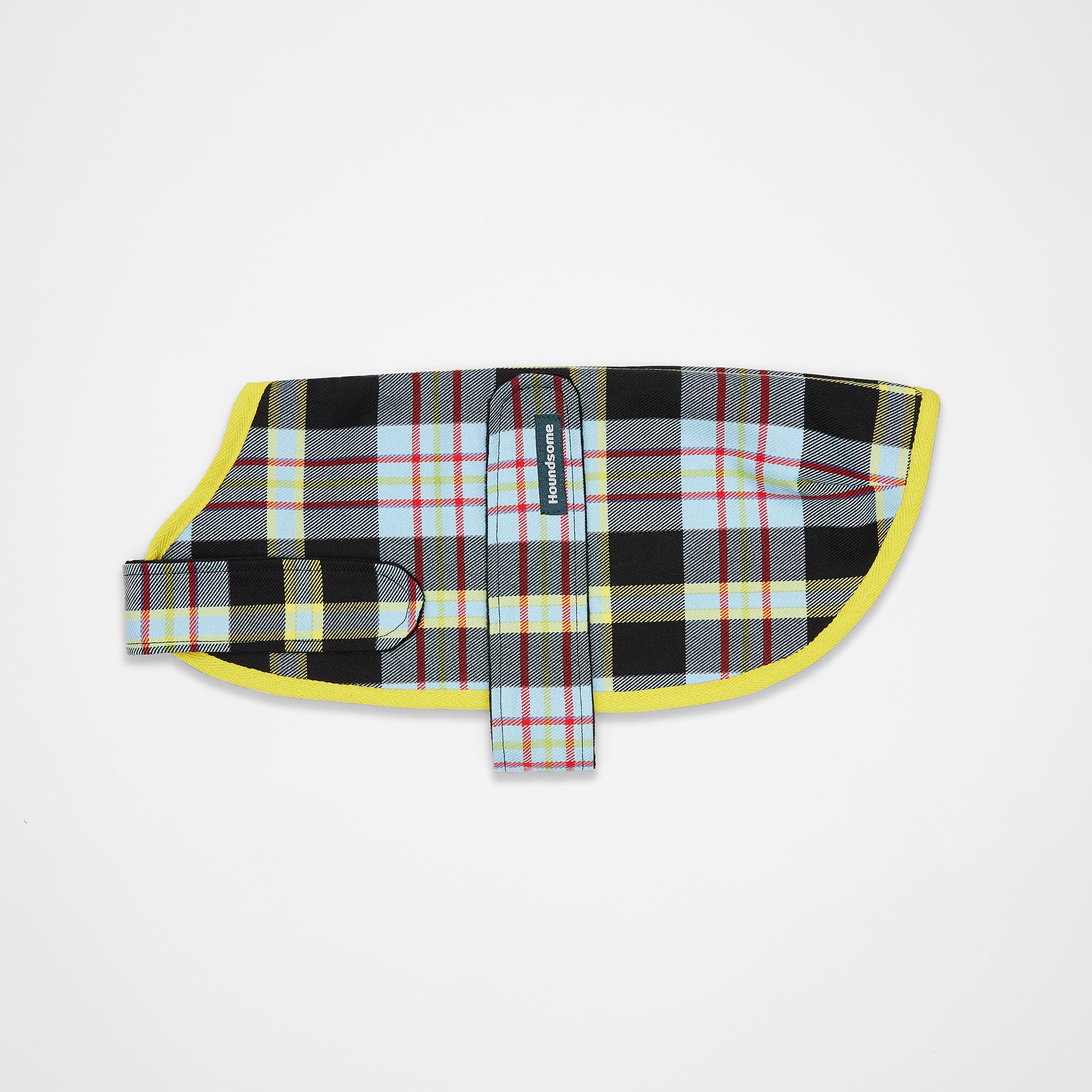 Make a statement in this Vivienne Westwood-vibe 100% cotton drill Margaret Jacket. A canvas-weight tartan design in scarlet, classic black, and yellow on a pale blue background. The inner layer of premium black velour fleece provides softness and extra comfort. Secured with Velcro®, the chest and neck straps are fully adjustable to give a snug fit. The centre-back opening makes it easy to clip your lead onto your dog's standard harness.